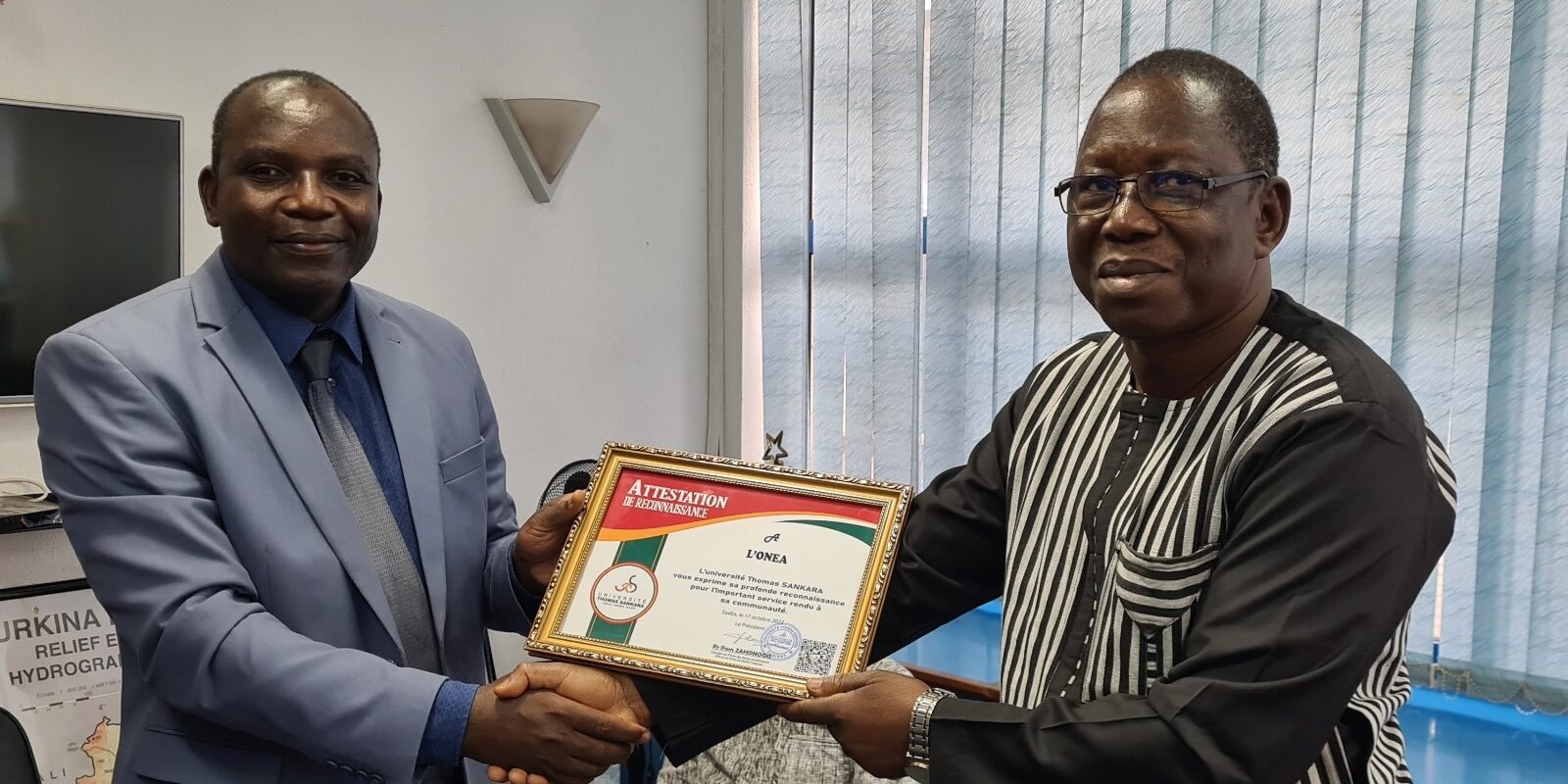En reconnaissance de ce service inestimable la Présidence l’UTS a décerné à l’ONEA une attestation de reconnaissance qui a été remise ce vendredi 20 octobre 2023 au siège de l’ONEA par son Vice-Président chargé des Enseignements et des Innovations Pédagogiques (VP-EIP) le Pr Windpagnangdé Dominique KABRÉ au Directeur Général Gilbert BASSOLÉ.